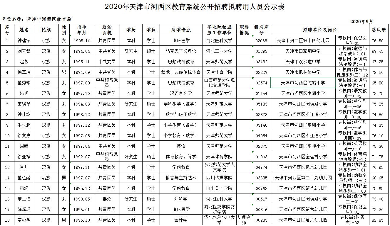 根据《2020年天津市河西区教育系统公开招聘(工作人员)工作实施方案》工作安排,下列人员经笔试、面试、体检、考察等程序确定为拟聘人员,现予公示。