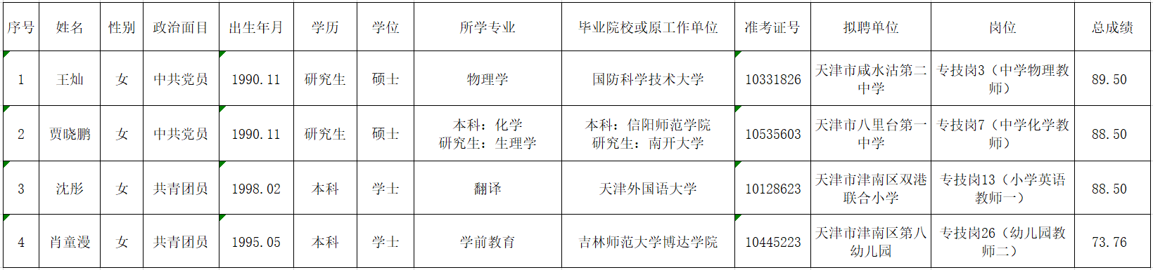 天津市津南区教育系统事业单位公开招聘拟聘用人员公示表 (第二批)