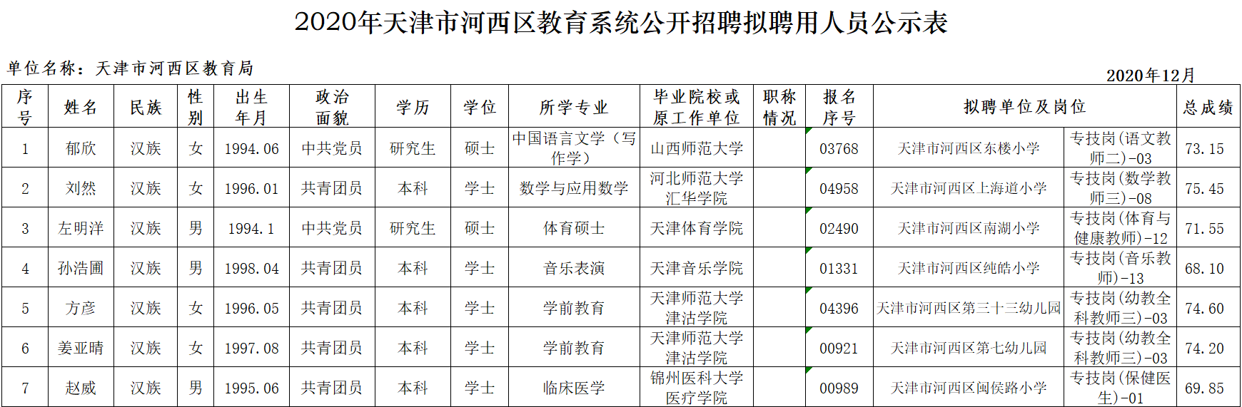 根据《2020年天津市河西区教育系统公开招聘(工作人员)工作实施方案》工作安排,下列人员经笔试、面试、体检、考察等程序确定为拟聘人员,现予公示。