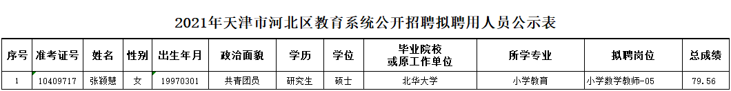 附:2021年天津市河北区教育系统公开招聘拟聘用人员公示表