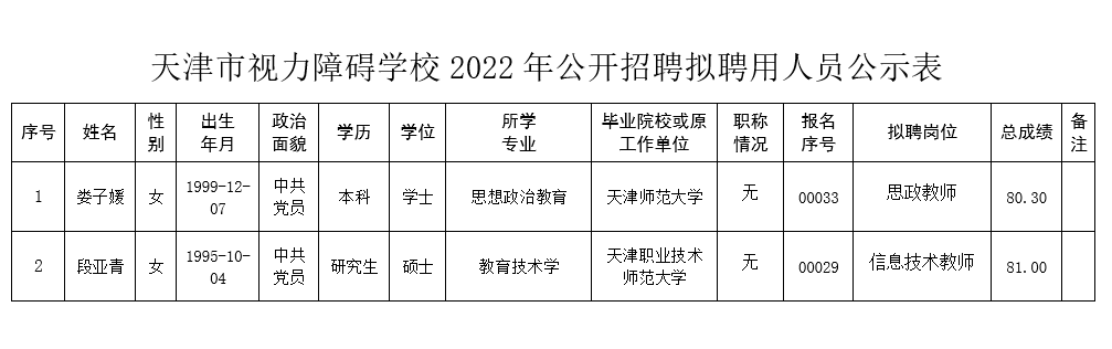 天津市视力障碍学校2022年公开招聘拟聘用人员公示