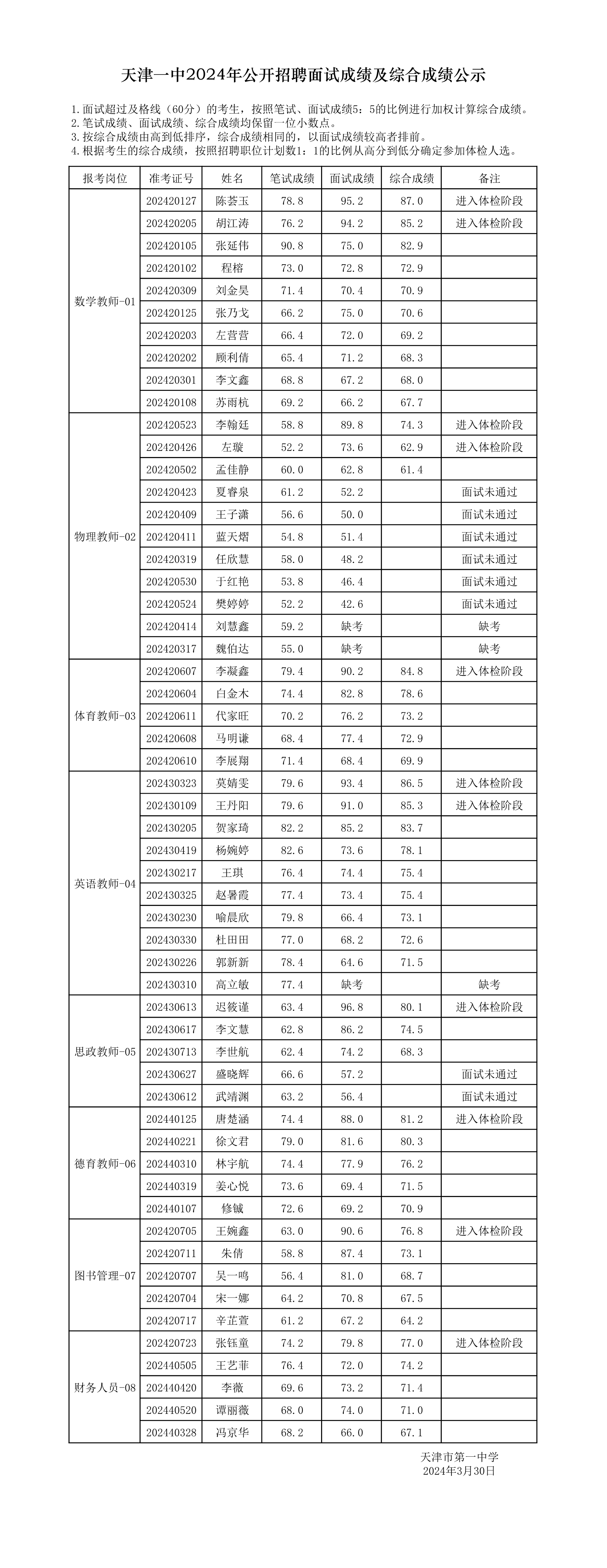 天津一中2024年公开招聘面试成绩及综合成绩公示