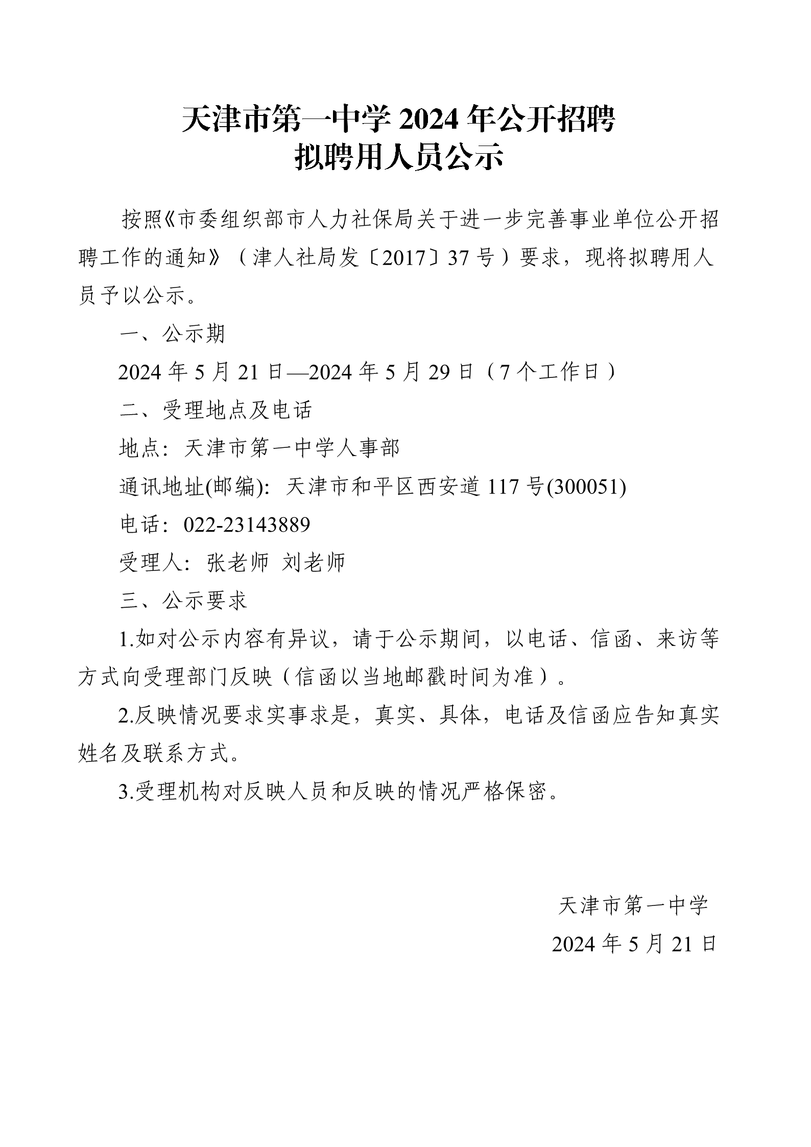 天津市第一中学2024年公开招聘拟聘用人员公示