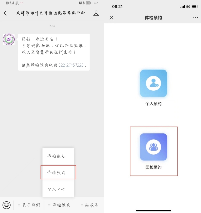关注微信平台公众号—“天津市南开区中医医院治未病中心”,在“体检预约”中“团检预约”一栏进行预约。