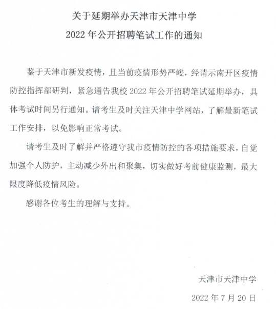 关于延期举办天津市天津中学2022年公开招聘笔试工作的通知