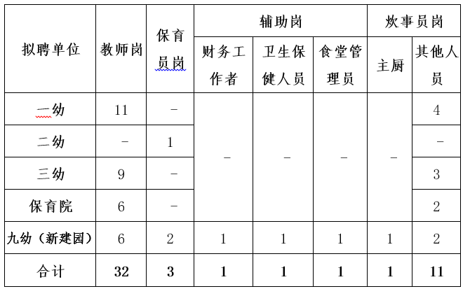 为进一步满足公立幼儿园的人才缺口需求,建设泰达街公里幼儿园高素质、专业化团队,推进幼儿园持续高质量健康发展,现提出面向社会公开选聘教师岗32人,保育员3人,辅助岗3人,炊事员岗12人,具体安排及要求如下: