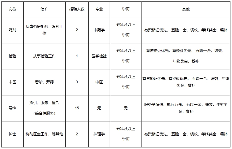 5、根据岗位类别,须具备对应的执业资格。分别为:中医医师以上职称(持有中医医师执业证、医师资格证);检验技师(士)职称;药剂师(士)职称;护师(士)职称;
