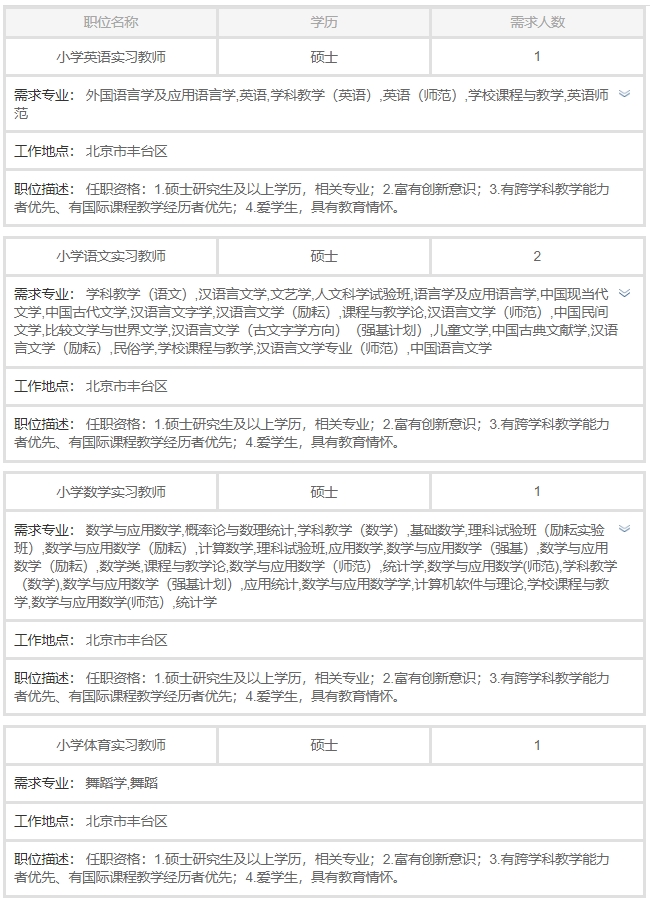 北京十一学校丰台小学教师实习岗位招聘5人