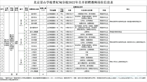 为满足学校教育教学需要,引进优质师资,提高教育教学质量,按照双方签订的《合作办学合同书》及北京景山学校和办学初期提出的建设现代化国际化学校的标准,拟在今年下学期开学前,通过在北京师范大学、东北师范大学、陕西师范大学、华东师范大学、河北师范大学、华中师范大学等师范院校进行宣传,面向高等院校公开招聘40名全日制普通类一本以上院校或区域知名师范类院校高校毕业生,具体岗位条件详见《北京景山学校曹妃甸分校2022年公开招聘教师岗位信息表》。