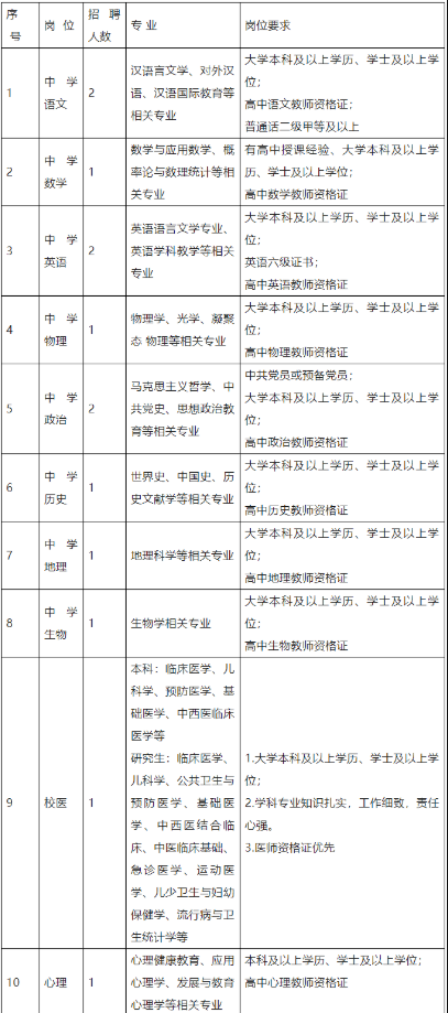 招聘范围:招聘年龄35周岁以下(截至到报名日期),大学本科及以上学历、学士及以上学位,具有高中对应学科教师资格证书。教育教学经验丰富、有突出业绩者年龄可适当放宽到40岁。