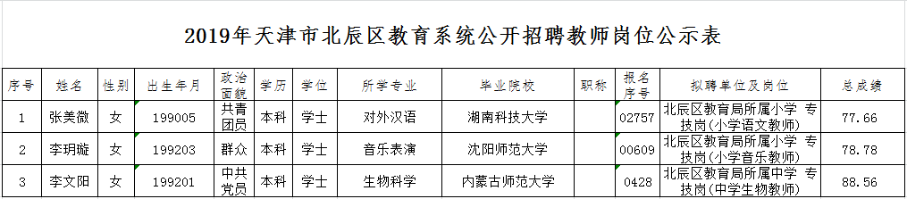 2019年天津市北辰区教育系统公开招聘工作人员拟聘用人员公示