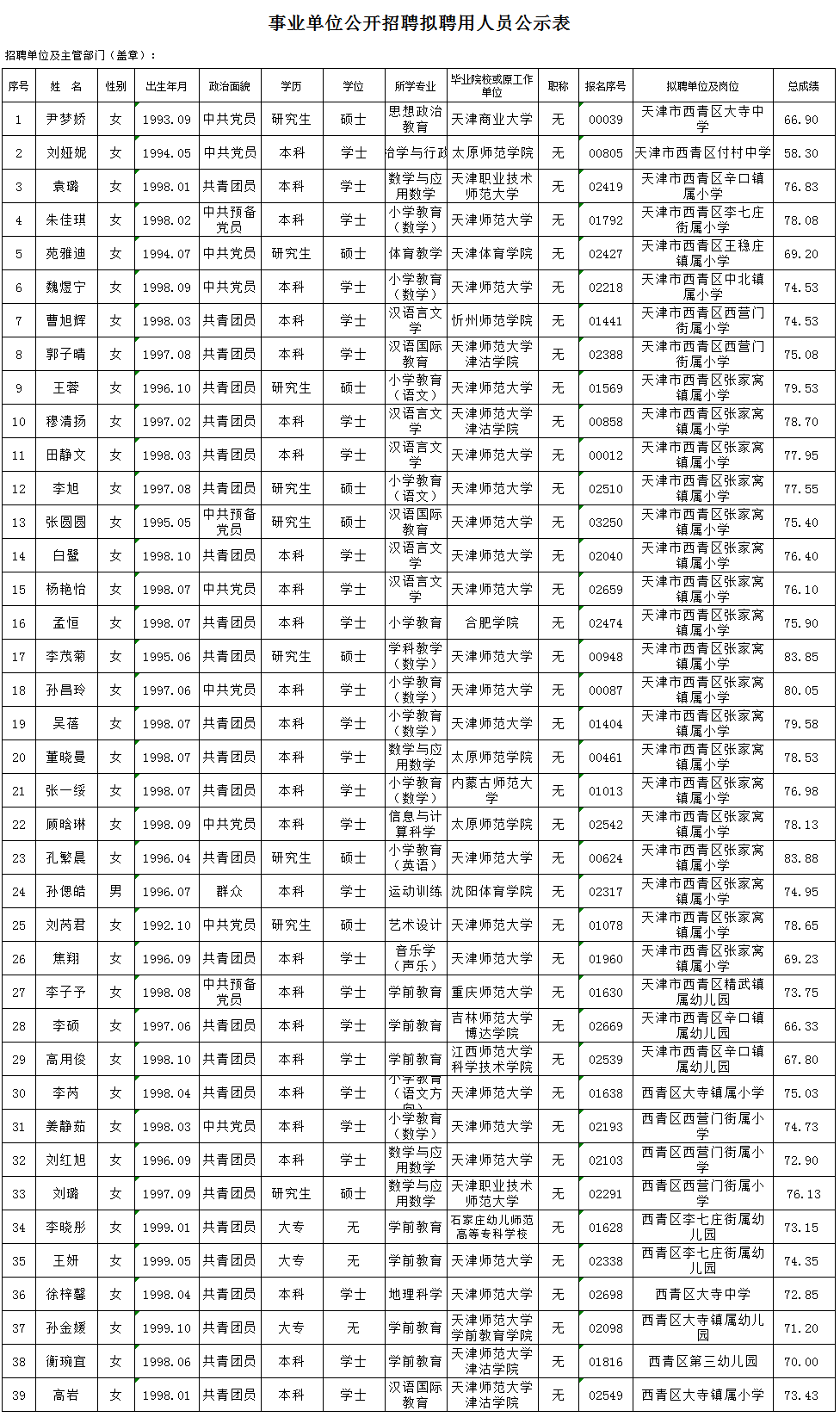 天津市西青区2020年公开招聘教师工作,经笔试、面试、体检、考察等环节,共计39人符合条件,按照《西青区2020年公开招聘教师公告》,现将拟聘用人员予以公示。
