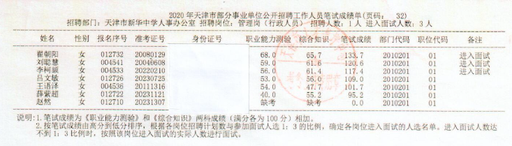 天津市新华中学2020年公开招聘行政人员笔试成绩公示