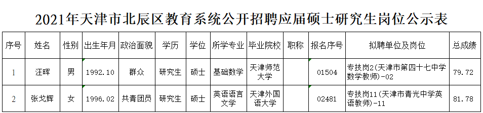 2021年天津市北辰区教育系统公开招聘应届硕士研究生拟聘用人员公示(第二批)