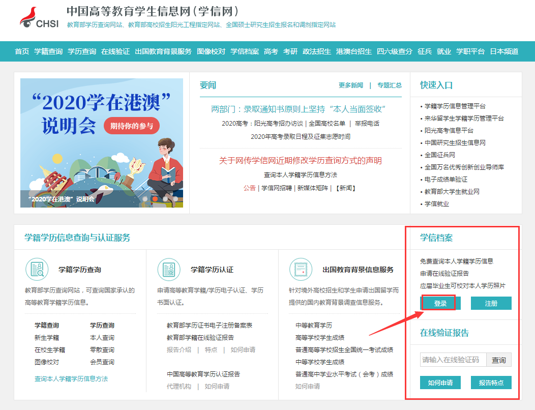 打开学信网站(https://www.chsi.com.cn/)-学信档案部分,点击登陆,进行登陆学信网站,输入账号和密码完成登陆。