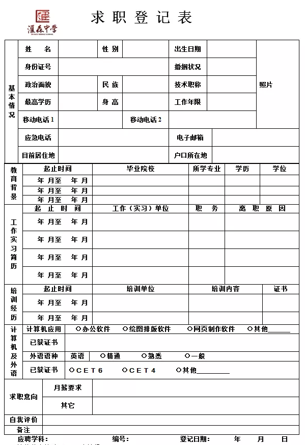 符合条件的应聘人员请将《求职登记表》、《个人信息资料表》填写完整( ★ 必填,无需再发送其他个人资料 ★ ),发至hsxzbgs@163.com。请扫下方二维码或搜索微信号“tjhszxzp”,关注“天津市汇森中学招聘”微信公众平台,后续笔试、面试等应聘程序将由此平台发布,请密切关注。