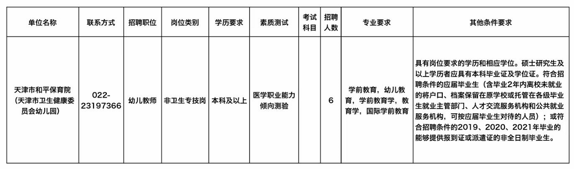 具体的招聘岗位、资格条件等详见《天津市卫生健康委员会所属天津市和平保育院(天津市卫生健康委员会幼儿园) 2021 年度公开招聘计划表》。