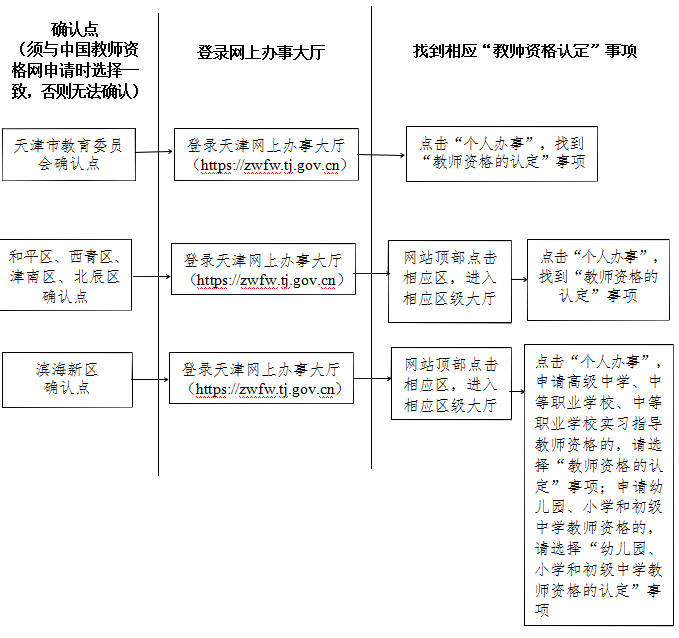 系统注册完成后,申请人可于 8 月 6 日上午 9:00 至 8 月 12 日下午 5:00 期间,登录天津网上办事大厅(https://zwfw.tj.gov.cn)进行网上确认。网上申请时选择天津市教育委员会确认点的申请人,登录后点击“个人办事”,即可找到“教师资格的认定”事项。网上申请时选择滨海新区、和平区、西青区、津南区、北辰区确认点的申请人,请在网站顶部点击相应区,即可进入相应区级大厅,再点击“个人办事”,即可找到事项。其中选择滨海新区确认点的申请人,申请高级中学、中等职业学校、中等职业