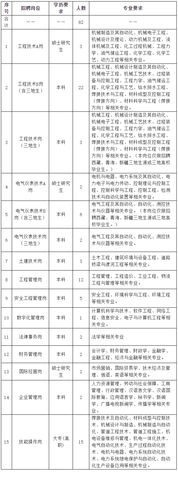 机械类、工程力学类、油气储运类、化学工程与工艺类、给排水工程类、材料类、焊接类、电气自动化类、测控技术与仪器类、控制工程类、土木类、建筑类、道路桥梁类、管理科学与工程类、工程管理类、工程造价类、工业工程类、安全类、环境科学与工程类、计算机信息类、软件类、网络工程类、财务管理类、人力资源管理类、工商及行政管理类、汉语言文学类、新闻与传播学类、法律类、市场营销类、国际贸易类、俄语类、英语类、金融类等相关专业。