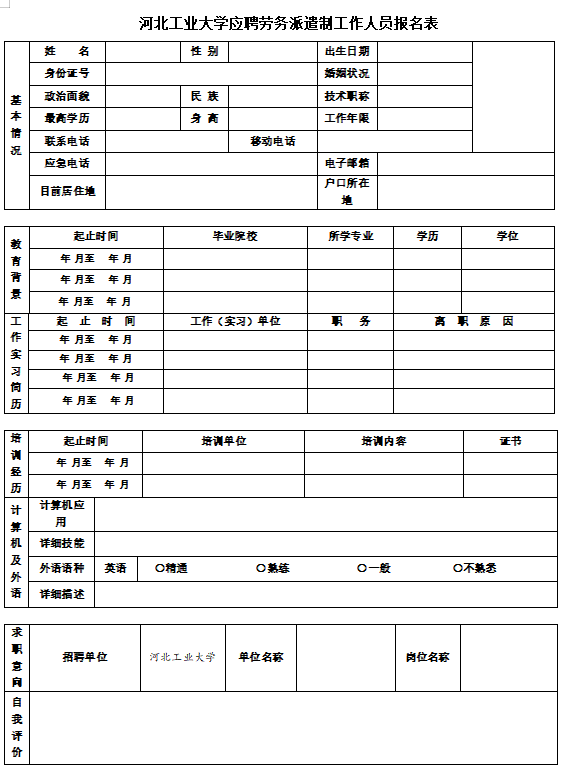 3.面试时务必携带《河北工业大学应聘劳务派遣制工作人员报名表》一份,本人身份证、学位证、毕业证等证件的原件和复印件各一份、教育部学历认证报告或学信网认证信息扫描件以及政审材料。面试具体时间另行通知。