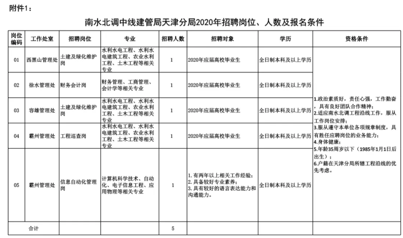 南水北调中线干线工程建设管理局(简称中线建管局)是水利部直属大型国有企业,负责南水北调中线干线工程的建设和运营管理。天津分局是中线建管局的二级管理机构,负责所辖范围内工程的运行管理。根据工作需要,天津分局现公开招聘2020年应届高校毕业生4人,社会在职人员1人,具体岗位及需求如下: