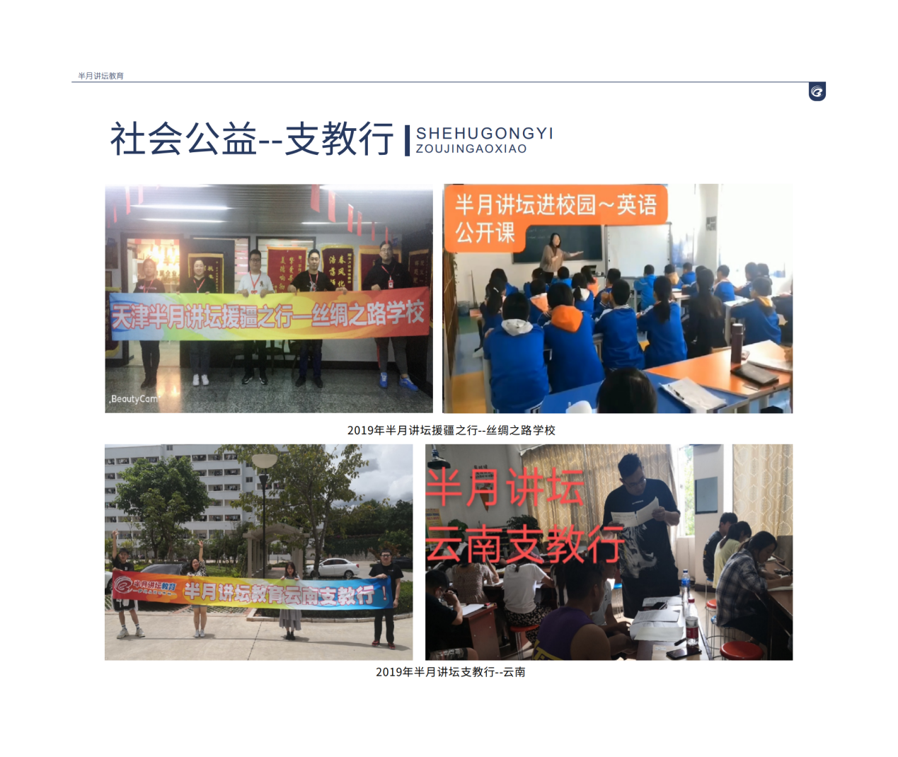 1,支教行--2019年,半月讲坛培训学校走进新疆,帮助新疆丝绸之路学校提升教学教研活动,走进课堂,给学生们讲课。2019年半月讲坛培训学校应当地学校邀请走进云南,对当地的大学生进行教师岗前培训
