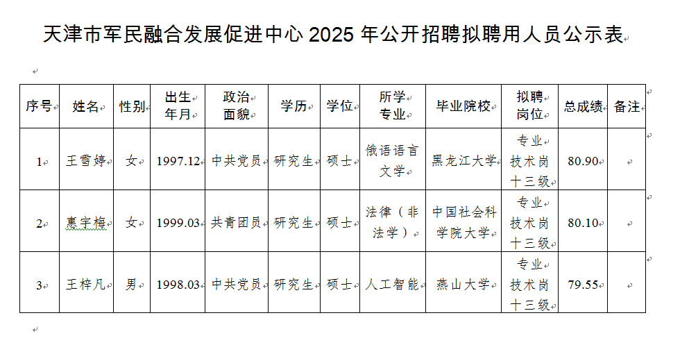 天津市军民融合发展促进中心2025年公开招聘拟聘用人员公示