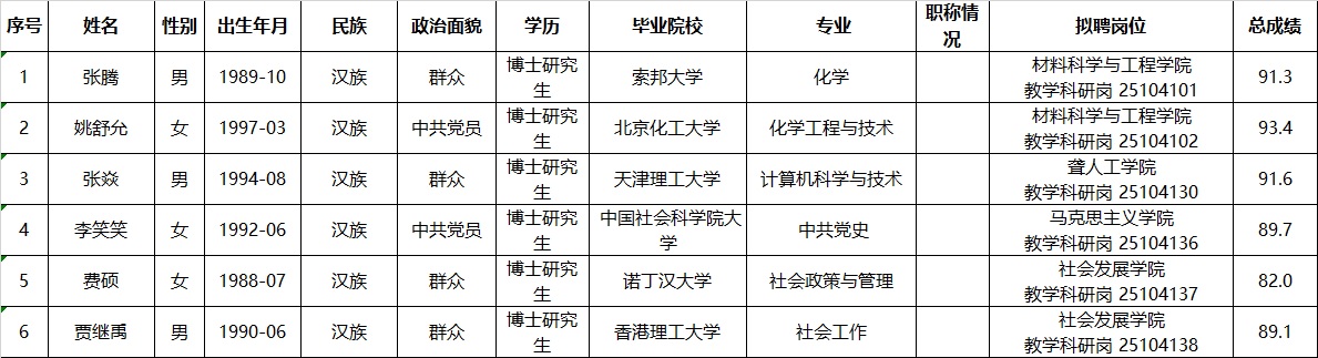 天津理工大学2025年公开招聘部分岗位拟聘人员公示