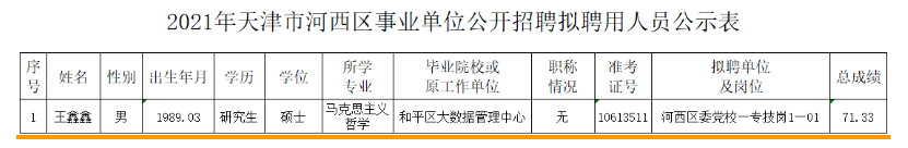 附:2021年天津市河西区事业单位公开招聘拟聘用人员公示表(第四批)