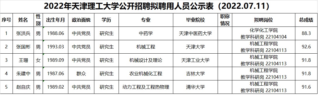 天津理工大学2022年公开招聘部分岗位拟聘人员公示20220711