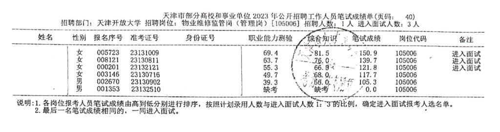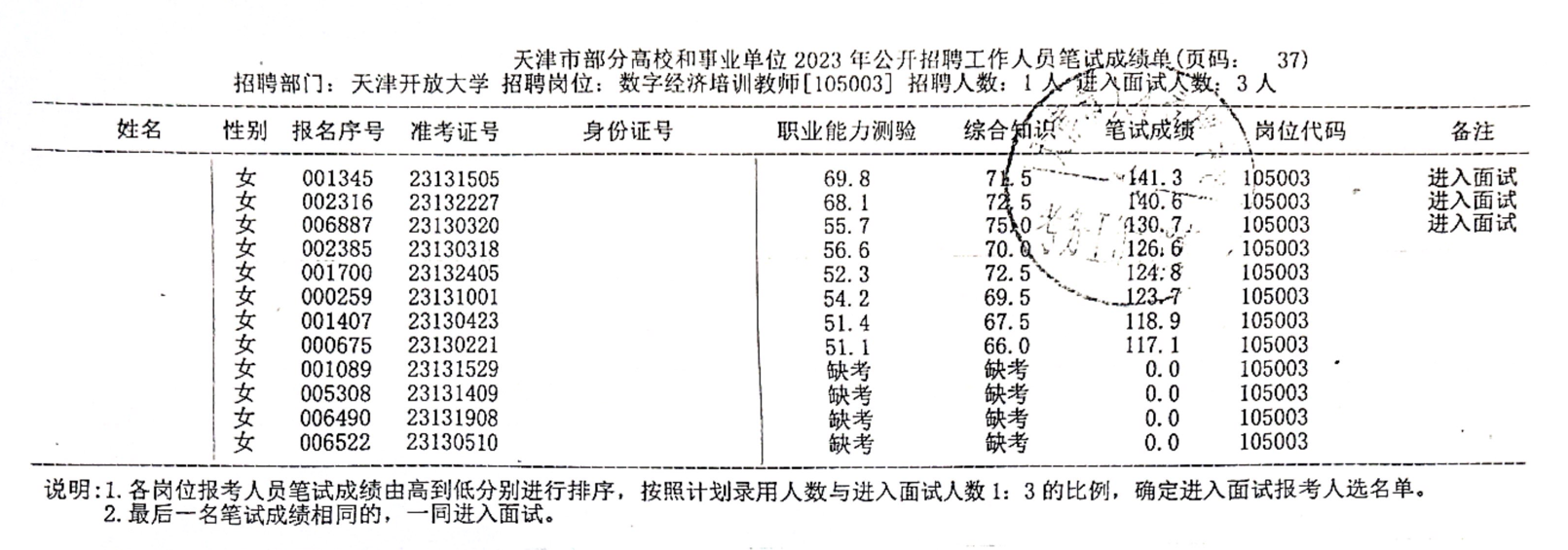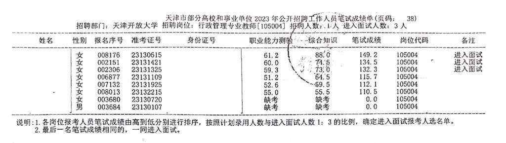 关于公布天津开放大学2023年公开招聘笔试成绩的通知