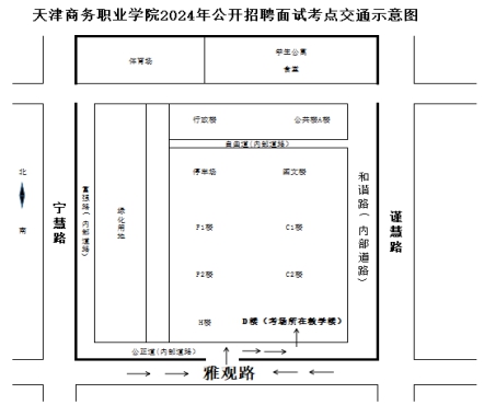 3.面试当天校内无法停放考生车辆,请从学校南门(雅观路)步行入校。考生车辆可停放在宁慧路或谨慧路,雅观路不可停车。交通示意图如下: