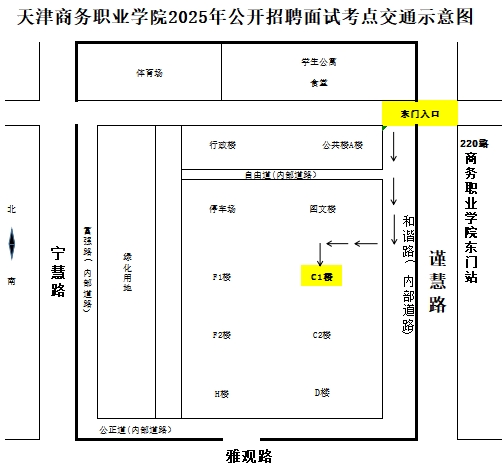 根据《天津商务职业学院2025年公开招聘专任教师及专职辅导员岗位工作人员方案》,我校公开招聘面试考试将于2025年5月17日(周六)下午进行。现将有关事项通知如下。 一、面试安排 (一)面试签到时间 2025年5月17日(周六) 13:30 (二)面试地点 天津商务职业学院海河教育园校区营销学院C1楼(天津海河教育园区雅观路23号) (三)面试缴费及面试准考证打印时间 2025年5月14日9:00-5月16日17:00,考生登录报名网站(天津市人才服务中心网https://www.tjtalents.com.cn)进行面试缴费并打印面试准考证。 二、专任教师岗位试讲教材目录 专任教师岗位试讲教材目录请见《天津商务职业学院2025年公开招聘专任教师岗位工作人员面试试讲教材目录》(附件)。 三、其他要求 1.面试当日考生应提前熟悉考点位置,预留充足时间,合理规划出行线路、方式,提前到达考点,以免影响面试。面试签到时间为13:30,考生需持准考证(准考证正、反面均不得涂改或书写)、二代身份证原件进入候考室,证件不全者不得参加面试,未按规定时间到达候考室的考生视为自动放弃面试资格。 2.面试当天校内无法停放考生车辆,请从学校东门(谨慧路)步行入校。交通示意图如下: