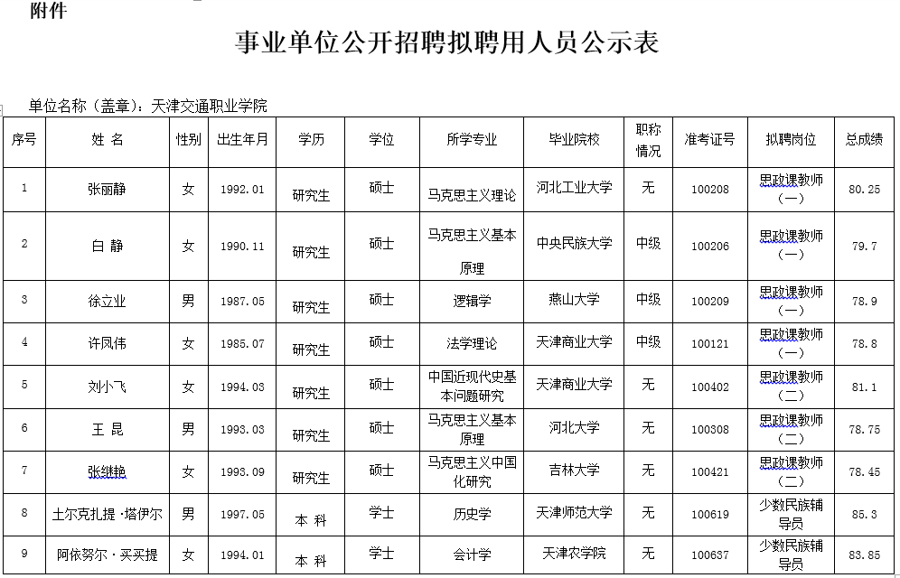 2020年天津交通职业学院公开招聘思政课教师、少数民族辅导员拟聘用人员公示