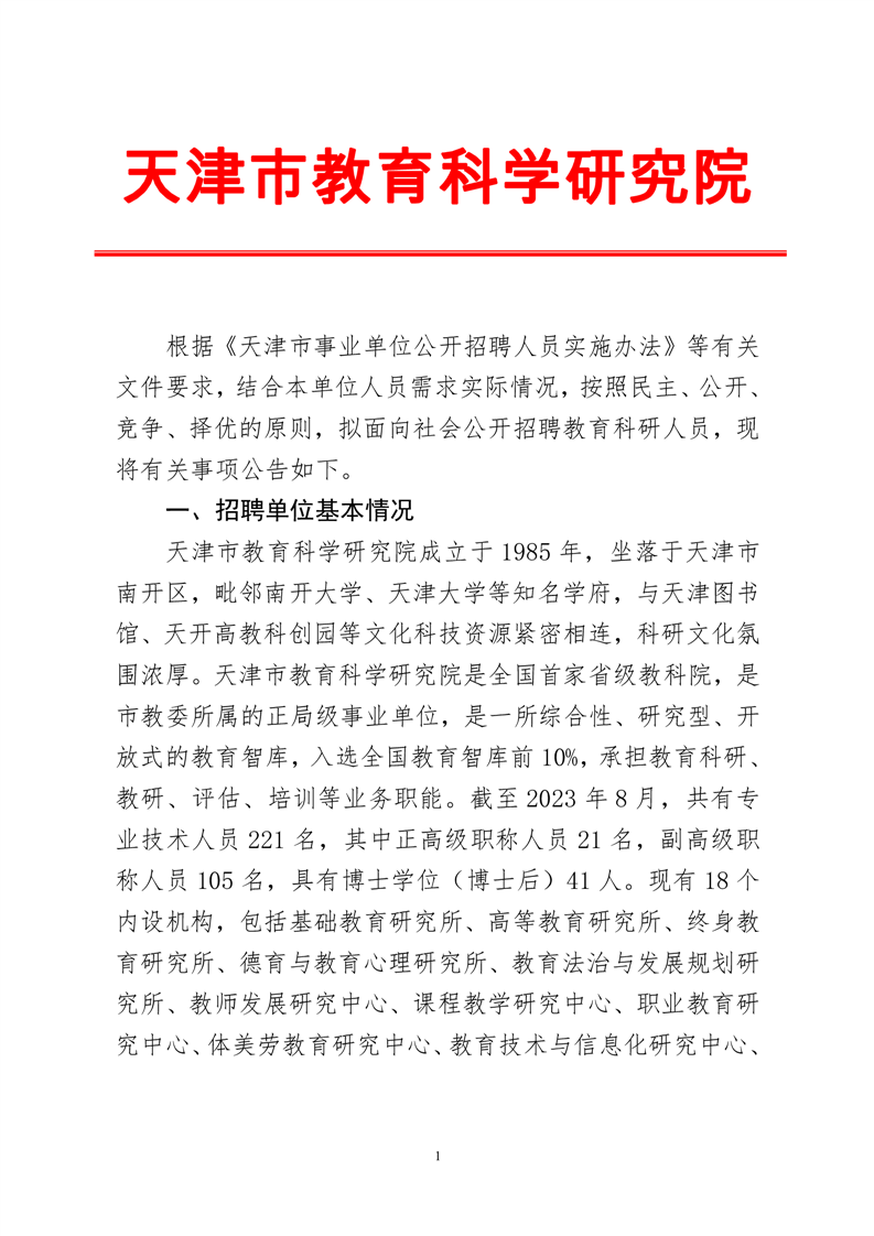 天津市教育科学研究院2024年公开招聘博士公告