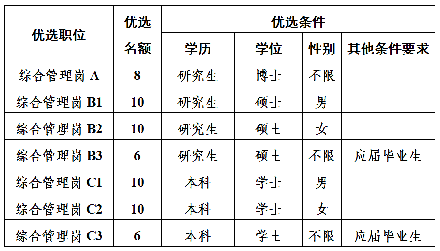 2020年市中区计划优选青年人才60名,其中,综合管理博士8名、硕士26名、本科生26名。综合管理岗A类职位不设开考比例,综合管理岗B类职位和综合管理岗C类职位根据报名、面试和考察情况,适当调整引进计划。若综合管理岗A类职位出现空缺,空缺职位计划转入综合管理岗B类职位;若综合管理岗B类职位出现空缺,空缺职位计划转入综合管理岗C类职位。具体详见优选职位表。