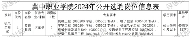 选聘岗位的具体人数和条件要求详见《冀中职业学院2024年公开选聘岗位信息表》(附件1)。