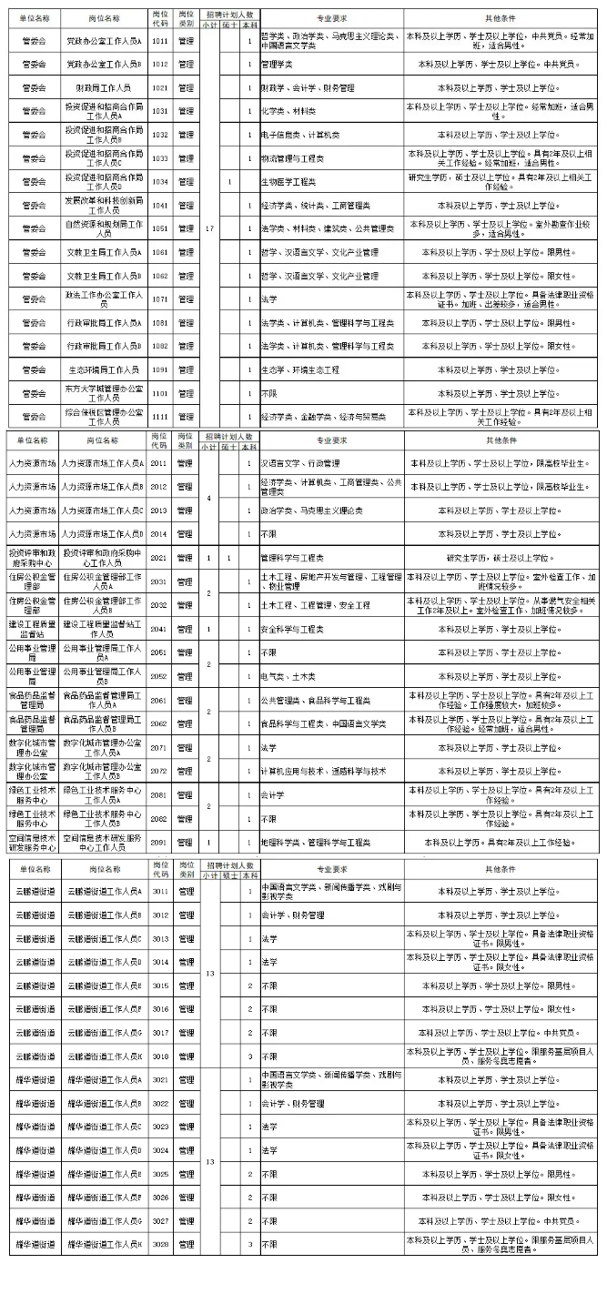 本次公开招聘廊坊开发区管理委员会内设机构工作人员17名,事业单位工作人员17名,街道工作人员26名(具体岗位见岗位信息表)。