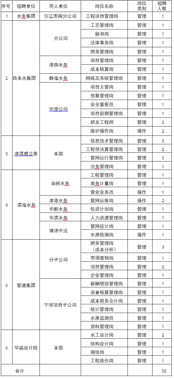 天津水务集团有限公司(以下简称水务集团)是天津市委市政府为推动我市水务事业发展,着力打造的城市水务统一运营平台和责任主体。为进一步推进水务集团深化改革与创新发展,将企业建成国内领先、行业一流的大型水务集团,现面向社会为所属单位公开招聘各类专业人才。