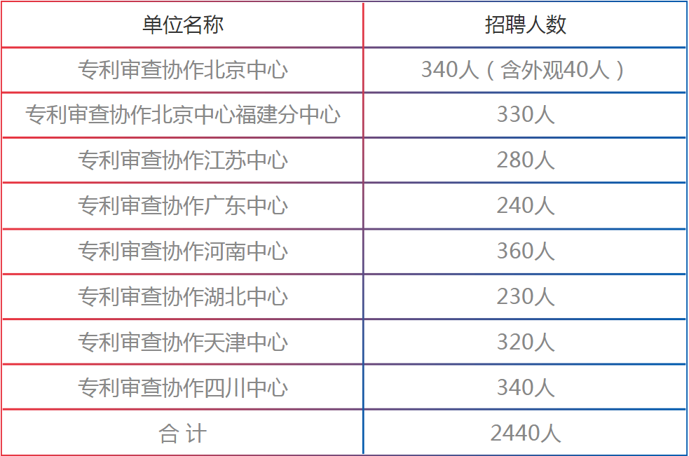 2021年专利审查协作中心将面向机械、电学、通信、医药、化学、光电、材料等各类理工科及工业设计专业招聘2440名专利审查员。具体招聘计划如下: