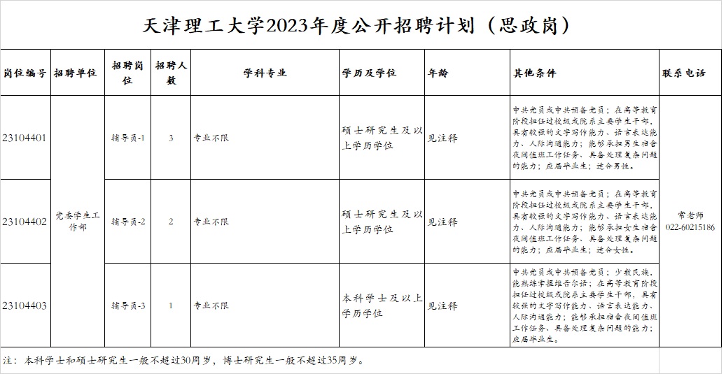 公开招聘方案于2023年3月2日在天津市教育委员会网站(http://jy.tj.gov.cn)和天津理工大学党委教师工作部(人事处)门户网站(http://rsc.tjut.edu.cn/)公开招聘专栏发布。具体招聘岗位见《天津理工大学2023年度公开招聘计划(思政岗)》(附件1)。