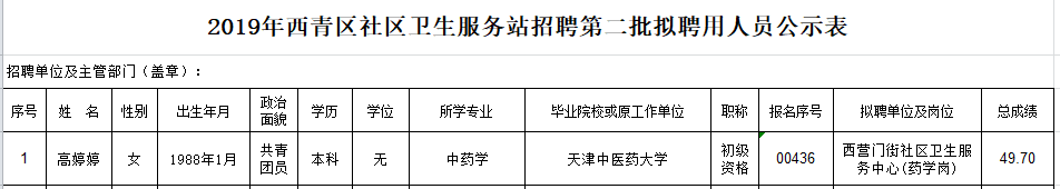 附件:2019年西青区社区卫生服务站招聘第二批拟聘用人员公示表