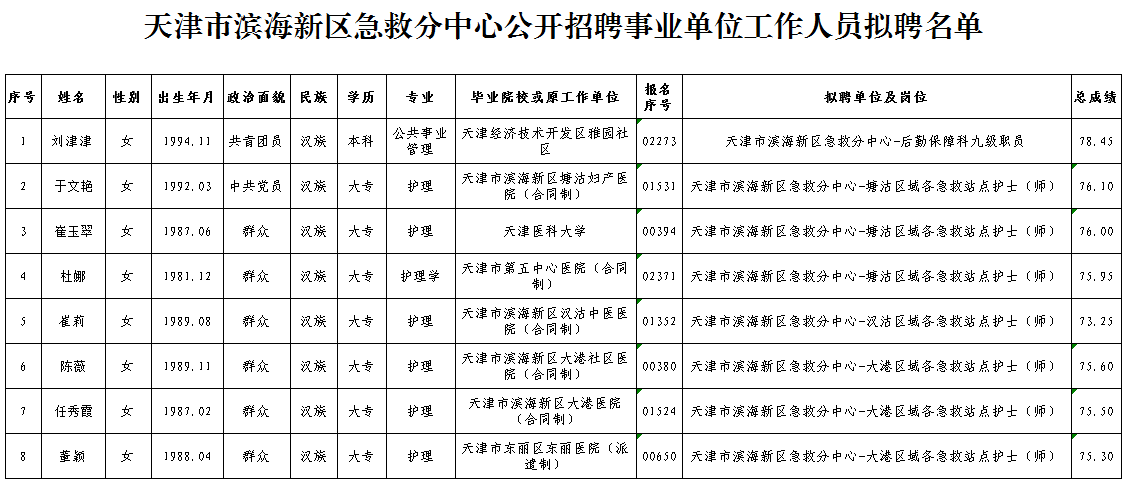 附:天津市滨海新区急救分中心公开招聘事业单位工作人员拟聘名单
