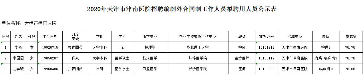 2020年天津市津南医院招聘编制外合同制工作人员拟聘用人员公示