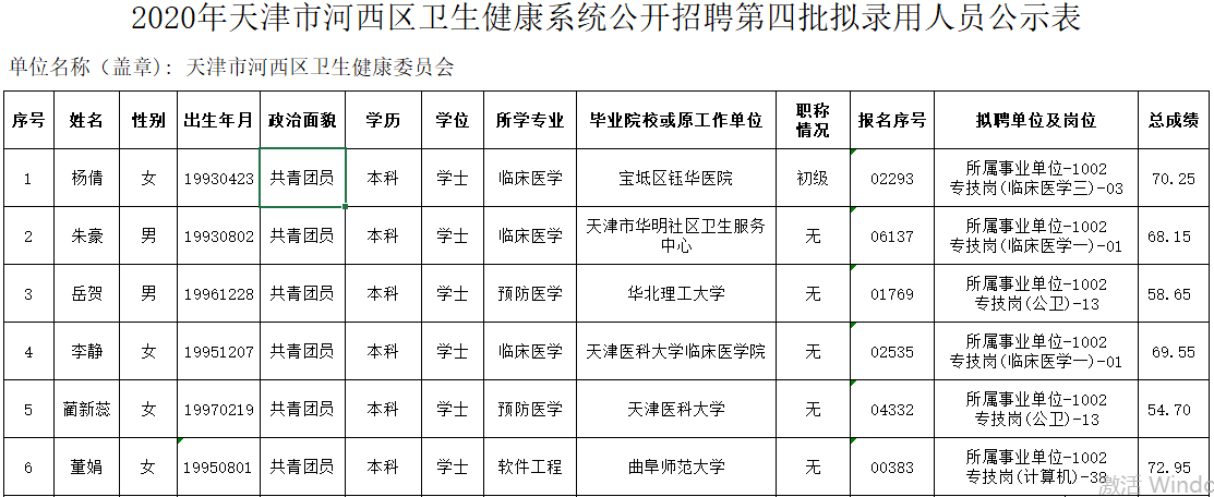 附:2020年天津市河西区卫生健康系统公开招聘第四批拟录用人员公示表