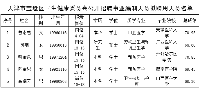 附件:天津市宝坻区卫生健康委员会公开招聘事业编制人员拟聘用人员名单