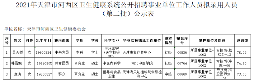 附:2021年天津市河西区卫生健康系统公开招聘事业单位工作人员拟录用人员(第二批)公示表