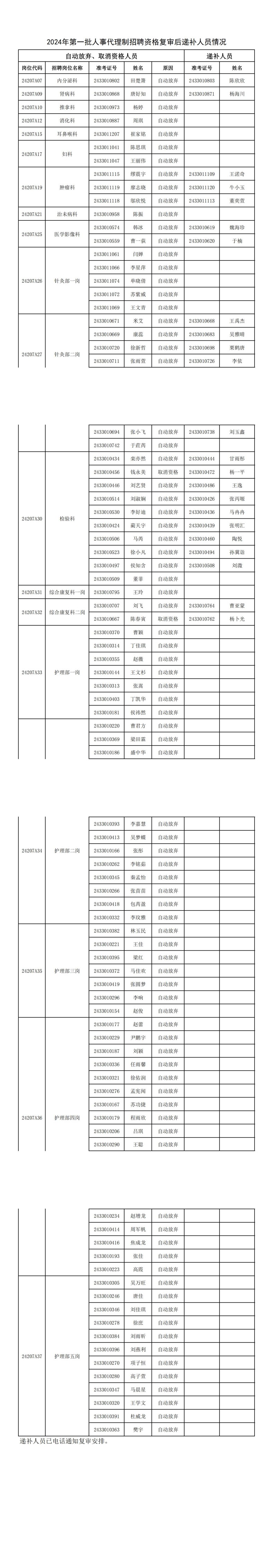 天津中医药大学第一附属医院2024年第一批人事代理制招聘资格复审后递补人员情况