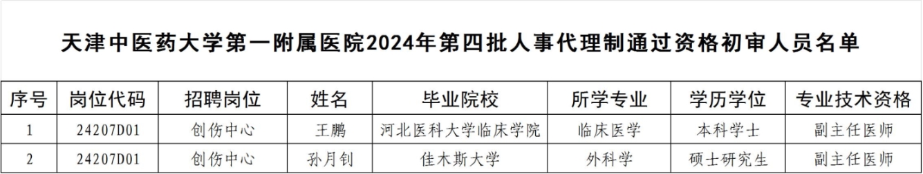 天津中医药大学第一附属医院2024年第四批人事代理制通过资格初审人员名单