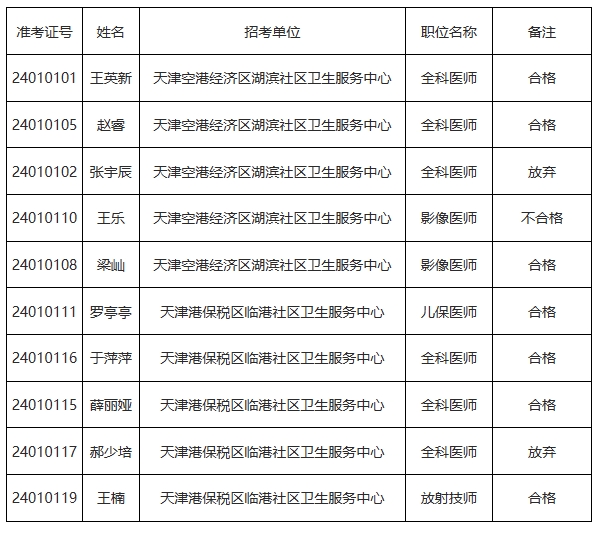 天津港保税区2024年度社区卫生服务中心派遣制工作人员补充招聘资格复审结果公示
